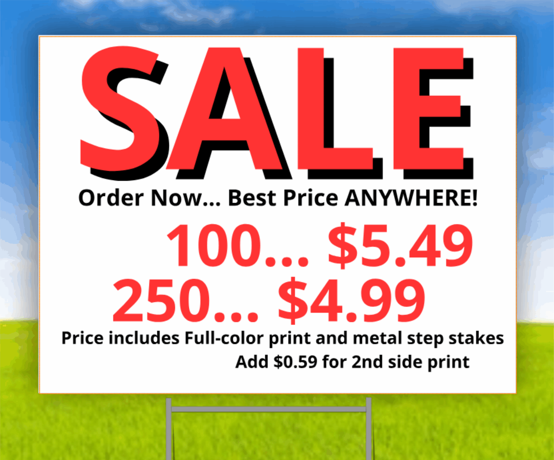 Our corrugated PVC yard signs are 24" wide by 18" tall, UV printed with your design printed on one or both sides. Metal ground stakes are included at no additional cost.
